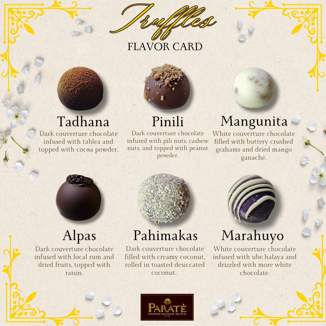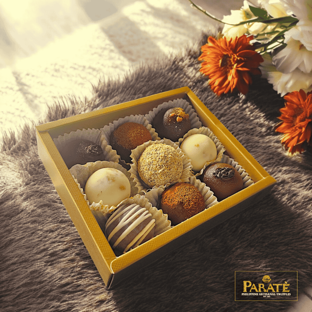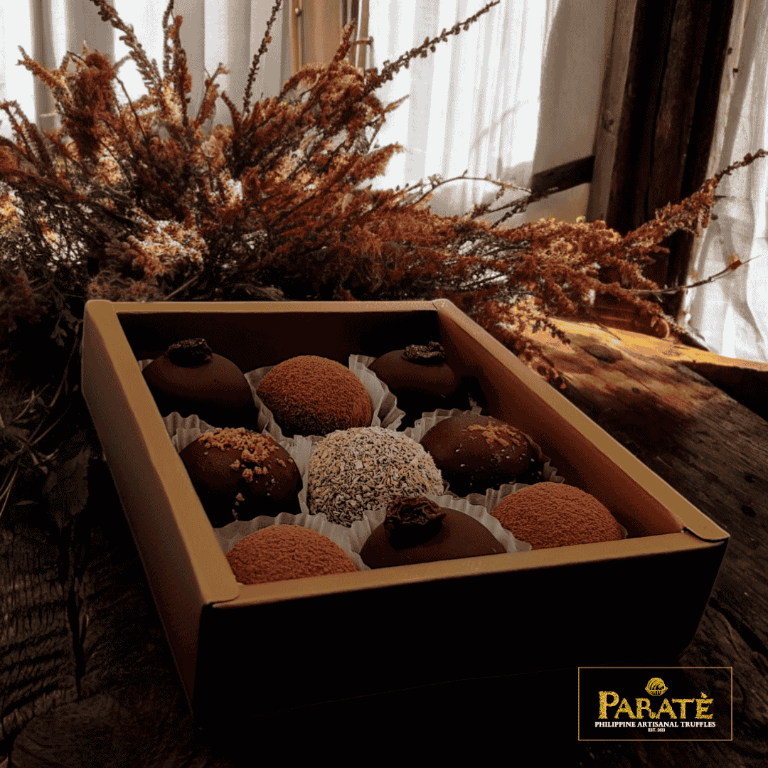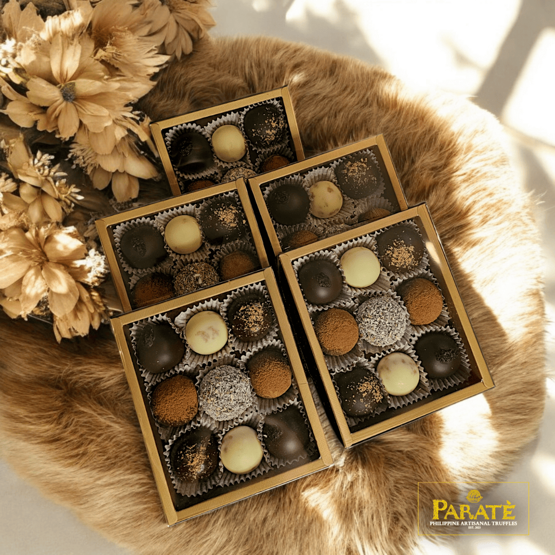Indulge in the exquisite flavors of Paratè’s Assorted Box of 9 Artisanal Truffles. Each box is a curated selection of our finest handcrafted truffles, made with premium Philippine cacao and the finest ingredients. Perfect for gifting or treating yourself, this assortment offers a delightful journey through a variety of rich, decadent flavors. The perfect Christmas gift for your family, friends and colleagues! We are also accepting bulk orders! (What’s Inside: 2 pcs. Tadhana, 2 pcs. Alpas, 2 pcs. Mangunita, 1 pc. Pinili, 1 pc. Pahimakas, 1 pc. Marahuyo)
