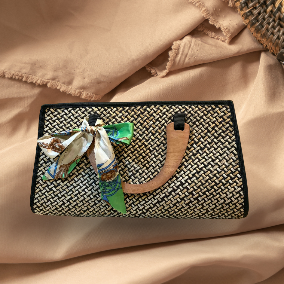 Handwoven from natural pandan or buri fibers with a refined, tight weave, this clutch-style bag features a polished wooden handle, fabric edging, and a chic scarf accent that adds elegance and character. It perfectly blends traditional craftsmanship with a modern aesthetic, making it a stylish statement piece while honoring Filipino heritage.
